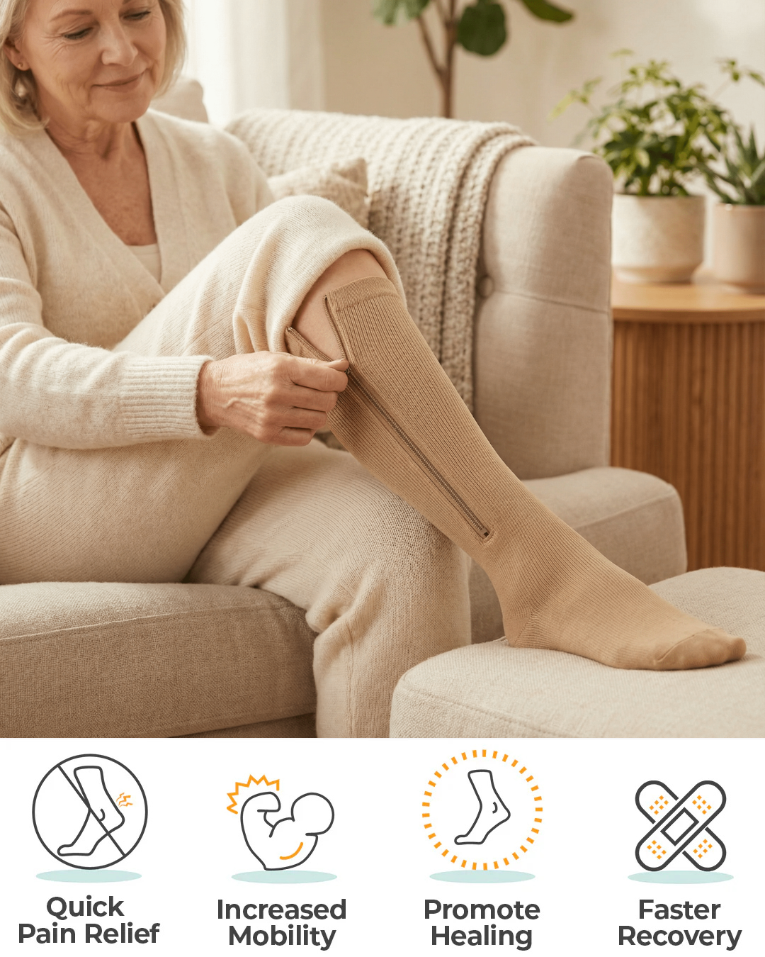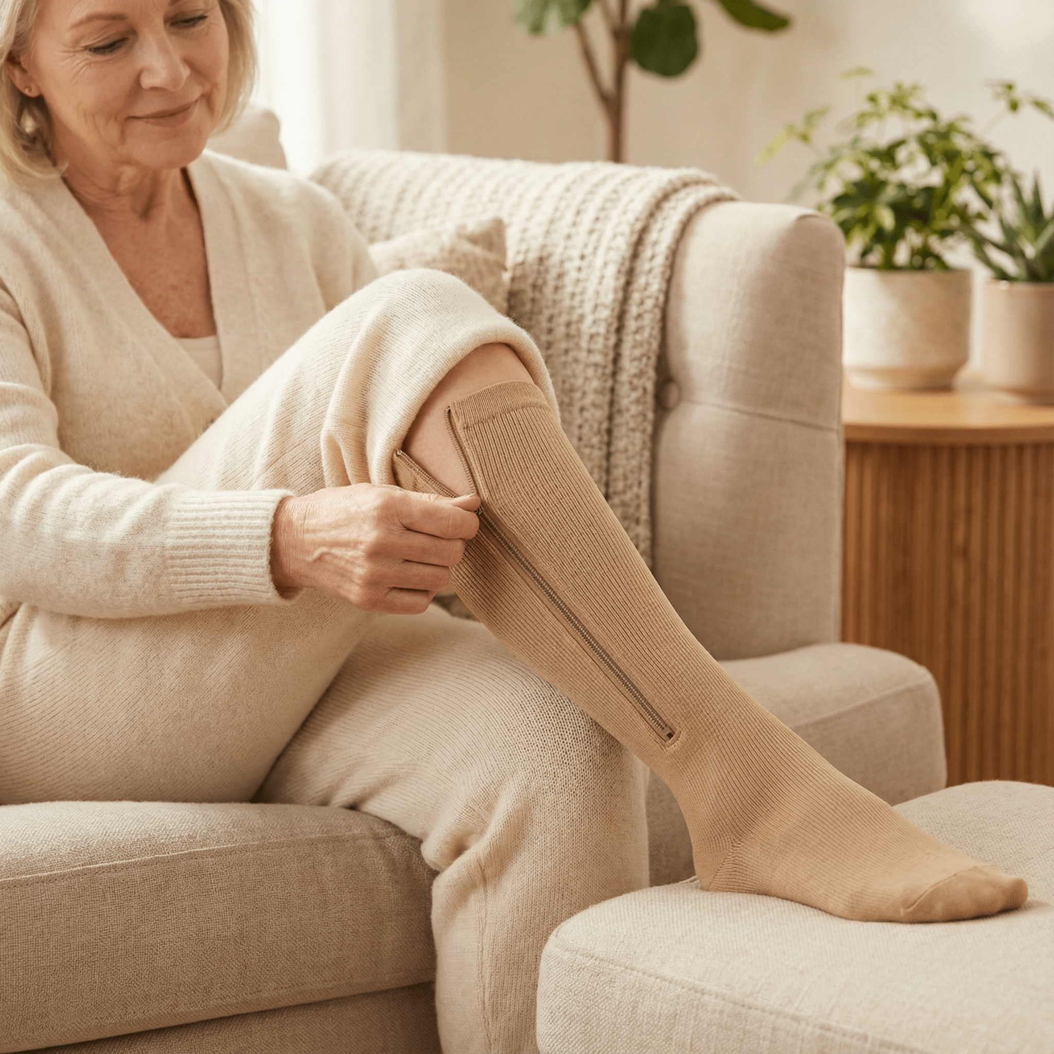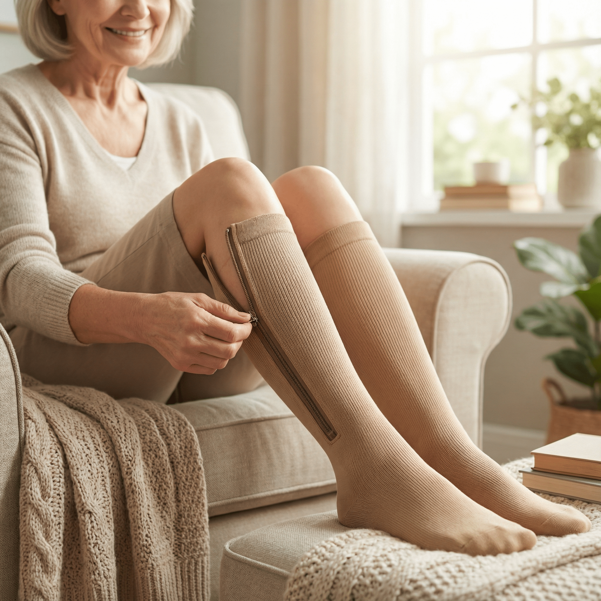Dankzij de stevige rits aan de zijkant zijn de kousen eenvoudig aan te trekken, zelfs bij beperkte mobiliteit. Open de rits volledig, schuif de kous over de voet en sluit de rits voorzichtig omhoog.